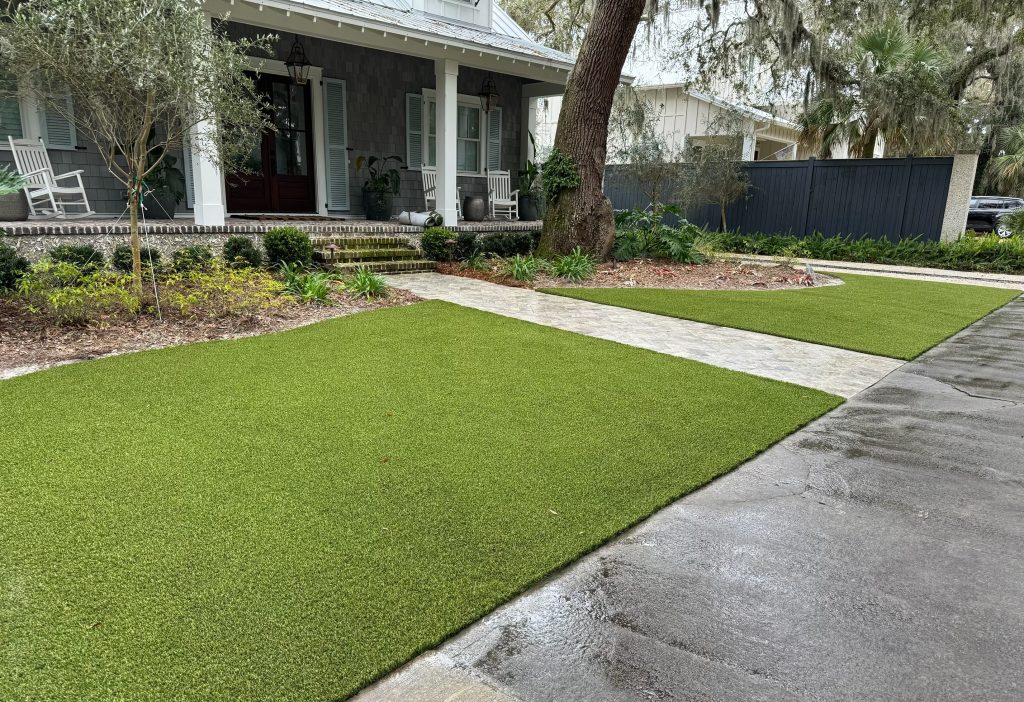 CALI 73 and 75 both are constructed using an upgraded W shape polyethylene face yarn. CALI 73 has a 1.75″ pile height and a 73oz face weight. CALI 75 comes with a 1.5′ pile height and a 75oz face weight. Both use a field green, tan and apple face with a green, tan thatch. The tan face yarn gives the CALI line a very unique look that mimics most natural grass. CALI73 is available with our TMG Pinnacle backing system while CALI75 uses our TMG Pinnacle Flow system. Recommended uses, landscape, golf, pet and playground.