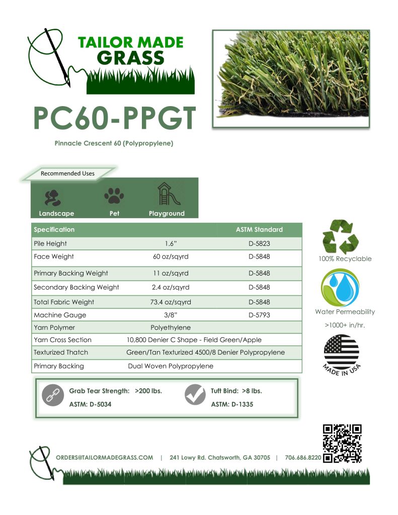 Pinnacle Cresent 60-PPGT and Pinnacle Cresent 60 both offer a high end yarn combination with a well thought out color combination of field green and apple with a green, tan thatch. Both styles have a 1.6″ pile height, a 60oz face weight and utilize a C shaped polyethylene face yarn. Both are available with our TMG exclusive backing systems with PC60 available on our Pinnacle backing and PC60PPGT available with Pinnacle Flow. The recommended uses are landscape, pet and playground