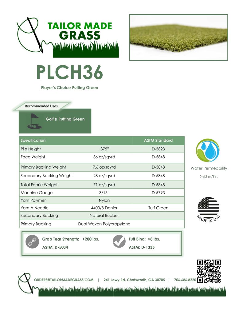 Players Choice 36 is designed for an indoor and outdoor putting surface. It has a true roll and good speed as soon as it’s unrolled. Excellent choice for a glue down over concrete. PLCH36 is made with a turf green Nylon fiber and has a .375″ pile height with a 36oz face weight. It is available with a natural rubber backing system. Recommended uses, putting surface, bocce ball.